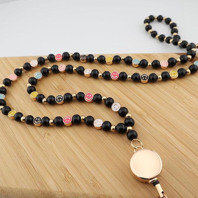 Smile Teacher Lanyard for Women with Retractable ID Badge Reel and Keychain Cute Happy Beads Lanyard