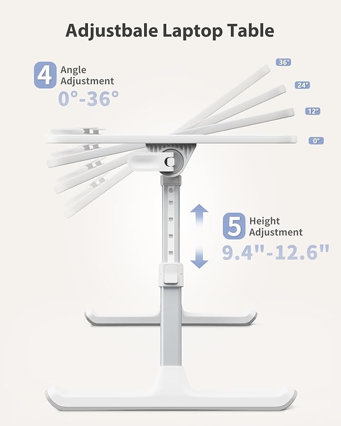 - Ergonomic Design Bed Desk - Soft wrist rest pad provides your wrist a comfortable place. The retractable blocker protects your computer from falling down. 5 adjustable heights(9.4"-12.6") and 4 adjustable angles (0-36°) provide you a more comfortable posture and avoid back & neck pain.