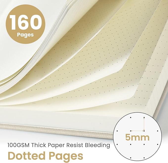 - 160 Pages Dotted Journal: Discover the freedom of 5mm-spaced dotted pages, perfect for bullet journaling, sketching, and organizing. The subtle dot grid provides structure without limiting creativity, helping you easily design layouts, track goals, and develop ideas in your personal style.