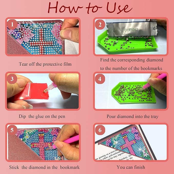- Easy to Use:Our bookmarks are very operate,first,remove the protective film , then find the corresponding number in the bookmarks places,pour the diamond number into the tray,dip the pen on the glue, start making them