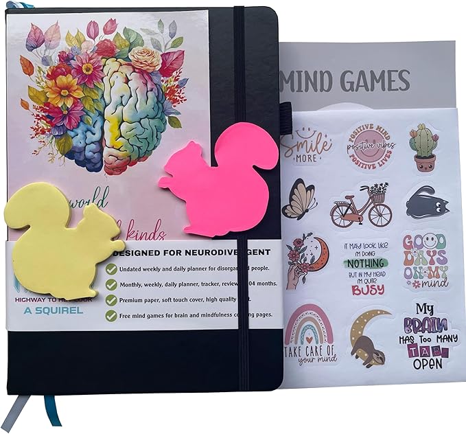 - UNLOCK YOUR POTENTIAL: Specifically designed for the ADHD brain, we cater to your unique needs. The planner includes two extra squirrel shape reminder notepads, a sheet of cute stickers, a mind game book, and an encouragement poster tailored just for you. The compact 7"x10" size lays flat for easy writing and viewing. Made from faux leather and elastic closure, it's durable for everyday use.