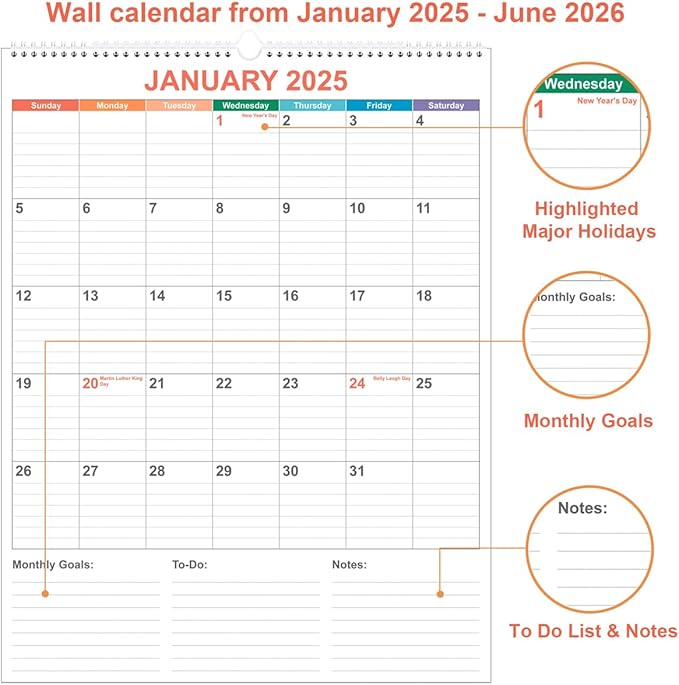 Large Calendar 2025-2026 with Spiral Bound - 18 Month Big Calendar from Jan 2025 to Jun 2026, Vertical Large Monthly Calendar 2025-2026 for Wall, Calendario 2025, 22" x 17", Colorful