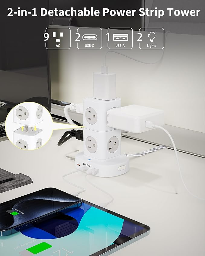 - 【12-in-1 Power Sation】This vertical power strip tower features a 2-in-1 removable power tower strip with 9 grounded outlets(1250W/10A), 2 USB-C ports, 1 USB-A port, the good solution for all your charging needs.