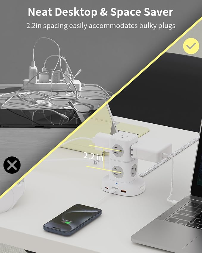 - Inverted for Tidier Use】The wide spacing between the outlets measuring 2.2in, prevents wire entanglement. Additionally, the vertical design can be used upside down to save even more space. With the included screws, this small tower strip can be securely mounted for stability.