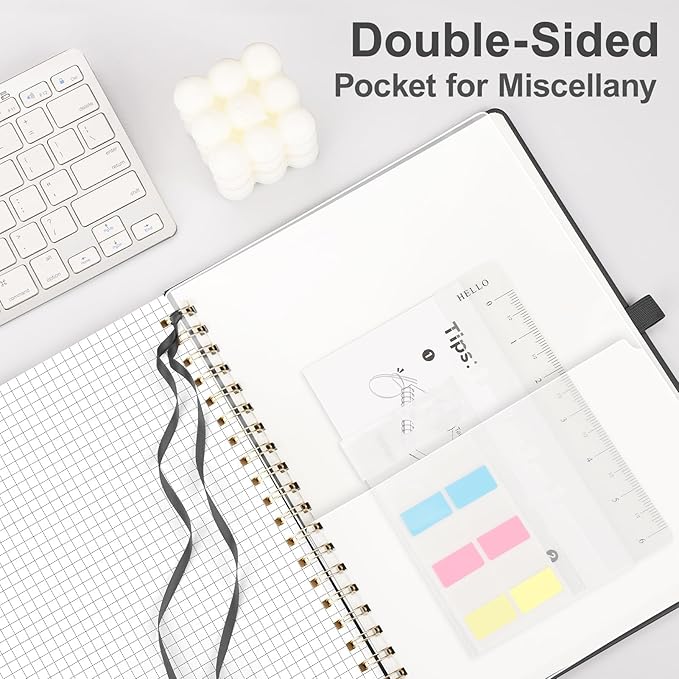 - PRACTICAL LAYOUT: Equipped an elastic band, a pen holder and removable bookmark ruler to keep your notebook organized. Comes with a DIY bookmark with a ribbon for self-attachment to the spiral, serving as a bookmark. Features a double-sided pocket for storing miscellany and 18pcs sticky notes for additional organization and reminders