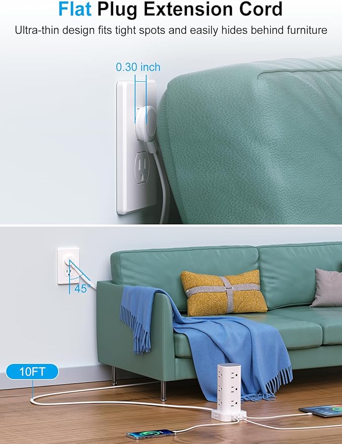 - Ultra-thin Plug & 10FT Extension Cord Power Strip Tower: This 0.3-inch sleek flat-head plug design provides a flush wall fit, perfect for tight spaces behind sofas, nightstands, bookshelves, and headboards. Its 45° angled outlets prevent blockage. The 10FT extension cord offers versatility for use in homes, offices, dorms, or as college supplies
