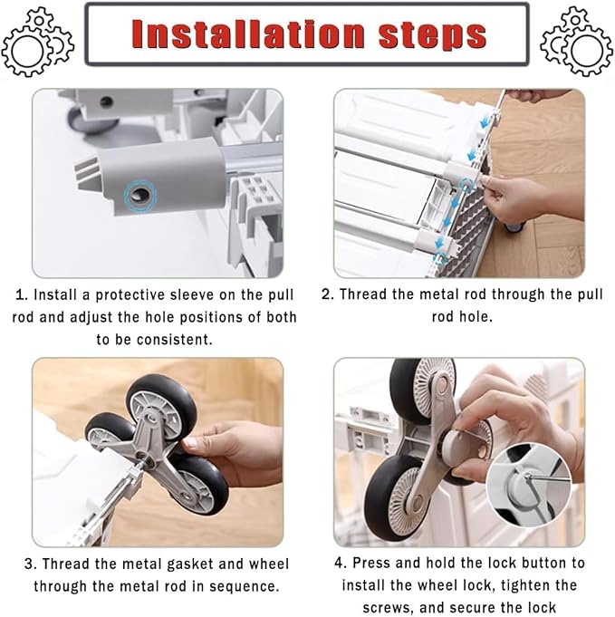 - The folding shopping cart with wheels is equipped with 2 detachable 360°rotating noiseless wheels and 2 detachable Climbing wheel sets that are composed of 3 wheels each.The wheels can be removed and replaced in a very simple way. Besides, the trolley has a cover to ensure the safety of items and to prevent rain drops when it rains.