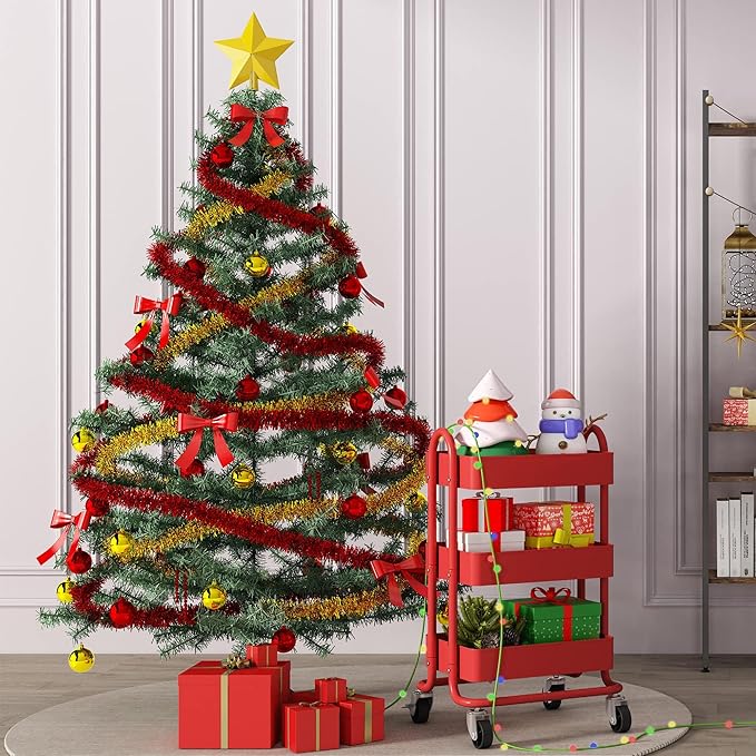 3-Tier Red Utility Rolling Cart,Kitchen Storage Carts with Wheels,Red Metal Rolling Cart for Office,Home,Kitchen,Garden๏ผ13.4"x18.1"x31"๏ผ Red