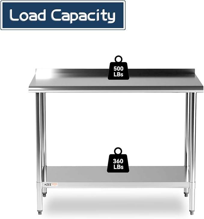 - High Quality Material: Our safety commercial stainless steel table top shelf is made of durable 18-gauge 430 stainless steel, which is excellent resistant to corrosion and rust. This kitchen prep table has a 500 lb. top shelf weight capacity and 380 lb. undershelf weight capacity for extra strength. You can store everything you want without shaking