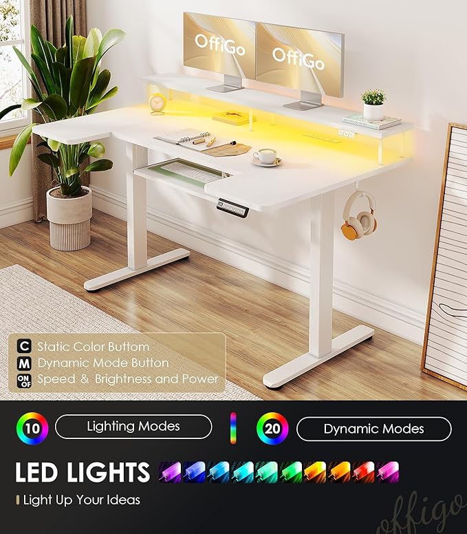 U Shaped Electric Standing Desk with Keyboard Tray, 55 Inch Height Adjustable Desk with Power Outlets & LED Lights, Sit Stand Table with Monitor Stand for Home, Office, White