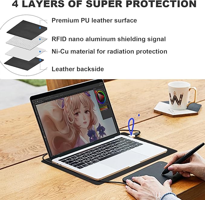 - PREMIUM QUALITY MATTER Our laptop pad is made of 4 layers of matter The middle two layers are layers of reinforced shielding Faraday fabric and aluminum foil The top and bottom layers are made of high quality leather to dissipate heat from your laptop