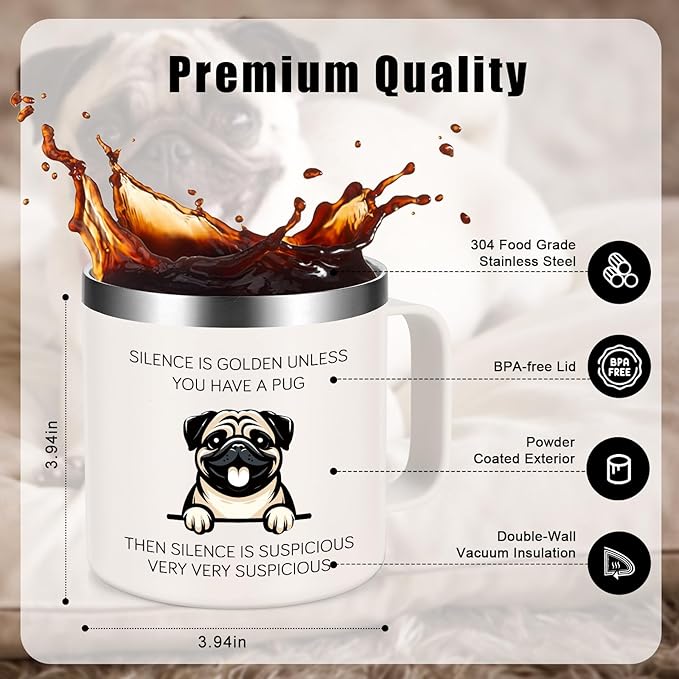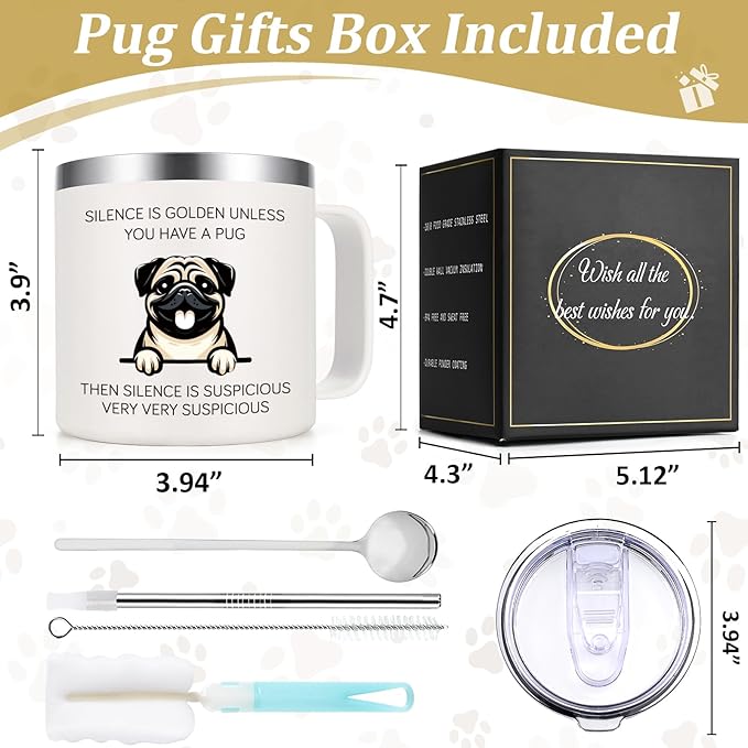 - Package Included: To enhance your enjoyment of favorite beverages and to express your appreciation for pug lovers, our pug gifts 14oz insulated coffee mug comes with a complete set of accessories. Each coffee mug includes 1 lid, 1 spoon, 1 stainless steel straw, 1 straw brush and 1 cup brush for your convenience
