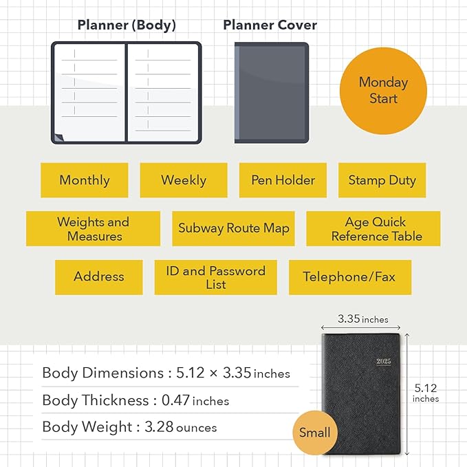 - Product Details: Size: 5.12in x 3.35in x 0.47in / Pages: 192 / Start Day: Monday / Layout: Monthly + Weekly / Paper Color: White