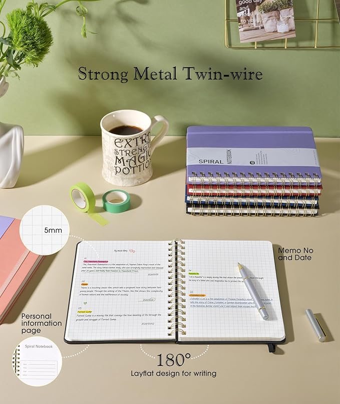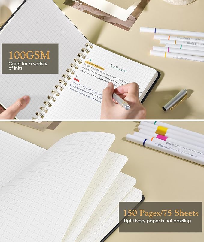 Graph Spiral Journal Notebook, A5 Hardcover Spiral Journals for Women Men, 100 GSM Graph Paper Notebooks, 150 Pages Spiral Bound Grid Notebook for Writing Note Taking Work 5.75" x 8.38" Black