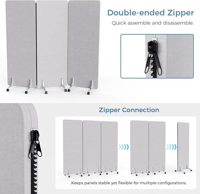 - Easy Assembly: No drilling required—simply link two panels with zippers, Our desktop panel is designed for quick and easy assembly, ensuring that you can set them up in minutes. Thus, our office divider can be used individually or combined to create a larger portable temporary wall. Simply set them up and enjoy your newfound privacy!