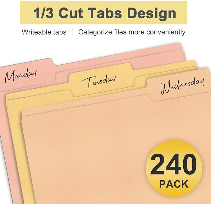 - Letter Size Paper:Streamline your organization with our pack of 240 high-quality, recyclable file folders. Each folder features 1/3-Cut Tabs for easy labeling and categorization.The construction is designed to hold 8.5×11 inch papers securely, ensuring your documents stay in order.