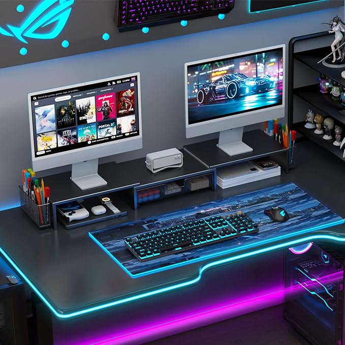 - 【Ample Storage Space】The dual monitor stand features two magnetic pen holders and a drawer, allowing you to easily organize your desk accessories and office supplies, keeping your workspace clear and tidy for easier access.