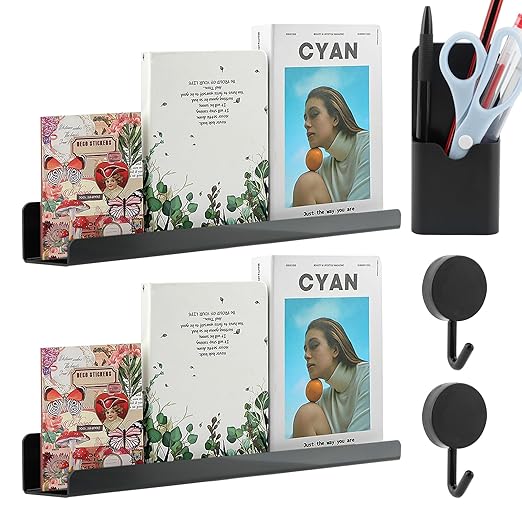 - 【PACKAGE CONTENT】You will receive 2pcs magnetic book shelf, 1pc pen holder and 2pcs adhesive hooks, 2 colors(white/black) for choose from, in the same usage scenario, the pen holder can be used to store pens, erasers and other small tools. Hooks can be used to hang small items such as keys, etc.