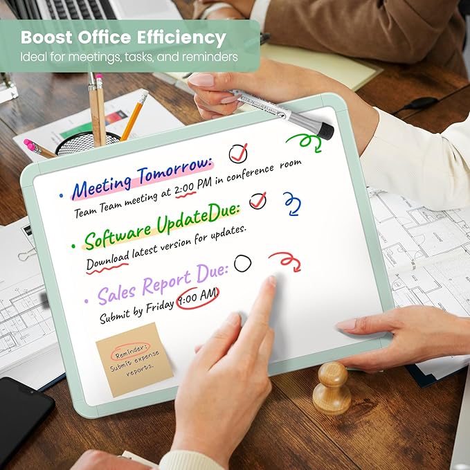 - Double-Sided Design, Double the Space: Unlike other small whiteboards, our double-sided whiteboard offers twice the writing area, making it ideal for organizing schedules, jotting down ideas, and managing multiple projects. It's the perfect family organizer and office whiteboard, enhancing productivity and creativity.