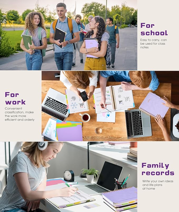 - 【5 Adjustable Dividers with 8 Tabs】Our 5 subject notebook include 5 removable plastic dividers, flexible and durable so you can move and organize them as your wish. It can be divided into 5 sections in total, which had enough features to keep organized on different subjects, instead of piles of random spiral notebooks that will slimmed your backpack down a ton! Come with 8 self-adhesive labels that separate information and make it easy to find categories to help organize your notes effectively.