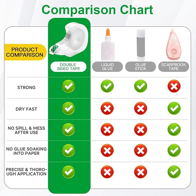 - ๐ ๐ฒ๐๐-๐ณ๐ฟ๐ฒ๐ฒ & ๐๐ฎ๐๐: Different from the ordinary glue or glue stick, Double Stick Tape won't cause any mess, there is no drying time and no wrinkling.