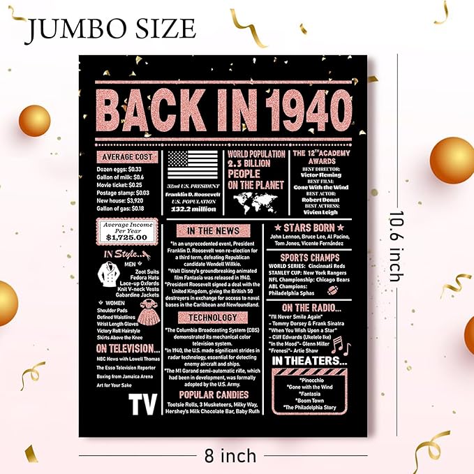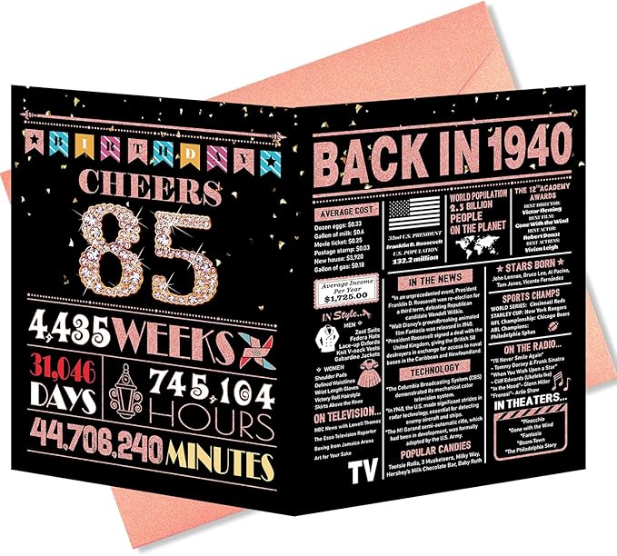 85th Birthday Card, 85th Birthday Decorations for Women, 85th Birthday Gifts for Grandma, Back in 1940 Birthday Card, Rose Gold