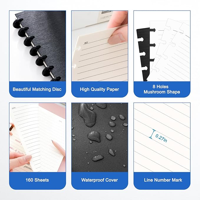 - 【Unique Design & Index Stickers】We use an innovative mushroom buckle disc system design, which is a perfect replacement for traditional bulky 3-ring or 6-ring binders to improve your office efficiency. And each of our notebooks comes with a set of small, medium and large index stickers, which allows you to customize the content of your notes according to the project or course theme and keep them organized.
