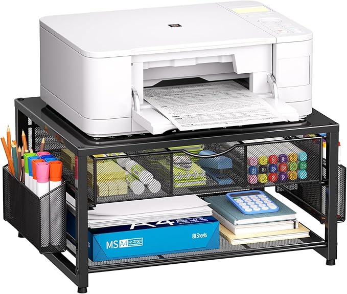 • 【Upgrade Printer Stand】This desk stand features a metal frame, 1 drawer organizer,1 paper letter tray, and 2 hanging pen holders making the stand an ideal choice for managing a desktop. Multifunction helps you not only save printer space but also manage the desk gadgets and stationery clean and tidy.