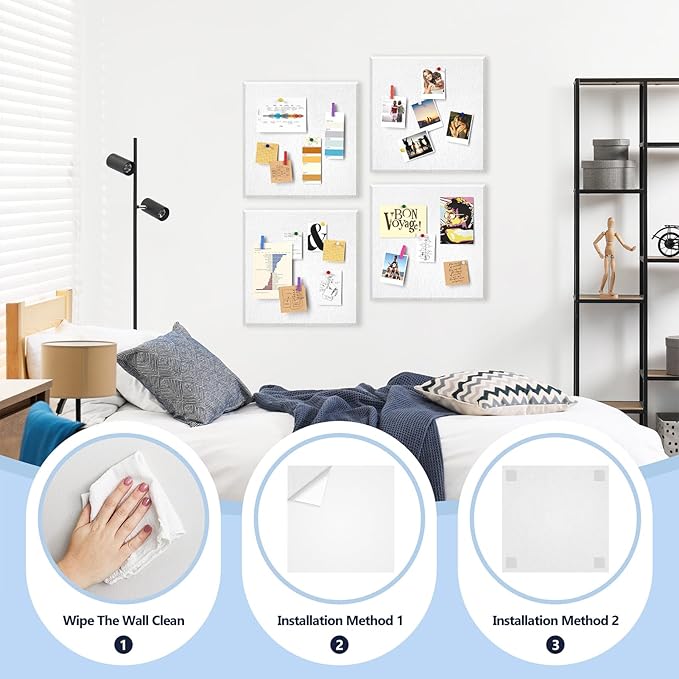 4 Pack Cork Board Tiles 12x12 Inches, 1/2" Thick Felt Cork Squares with 30 Push Pins, Bulletin Board Pin Board, Adhesive Cork Board for for Wall for Home, Office, and Kitchen (White)