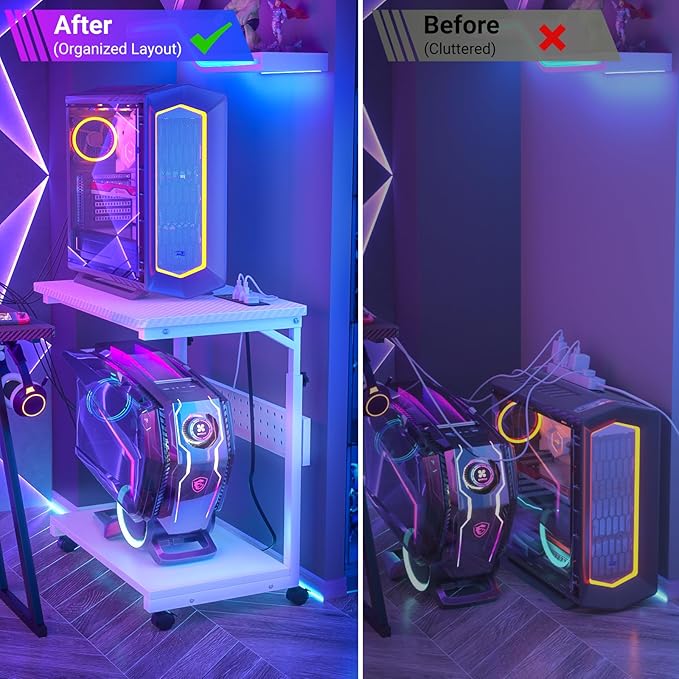 - CPU Holder with Outlets - Built-in useful electrical power outlets and USB ports (3 AC outlets + 2 USB charging ports) for your devices to plug in. It is handy and easier to plug in your computer tower, phone, iPad, or PC monitor. So you can keep cables better controlled.