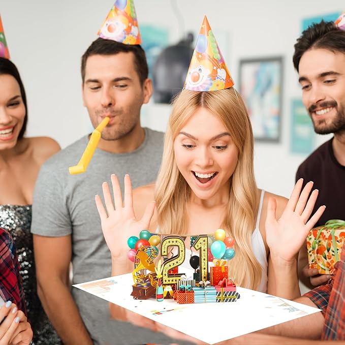 - 21st Birthday Pop Up Card: This cute 21th birthday pop up card is mini-masterpiece displays a beautiful 3D pop-up design.It can be popped up of features “21” with balloons and gift box. Ideal Creative Gifts for party. Makes your birthday or anniversary party’s decorations stand out