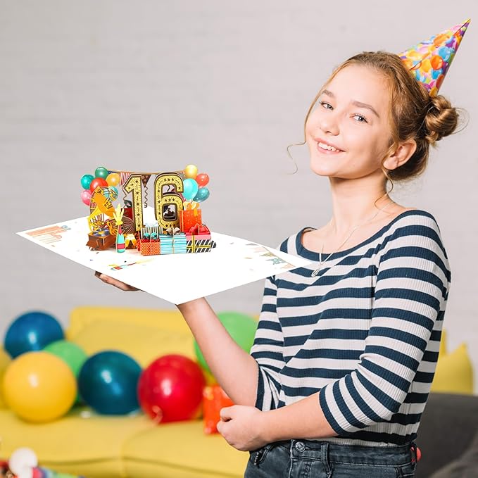 - 16th Birthday Pop Up Card: This cute 16th birthday pop up card is mini-masterpiece displays a beautiful 3D pop-up design.It can be popped up of features “16” with balloons and gift box. Ideal Creative Gifts for party. Makes your birthday or anniversary party’s decorations stand out