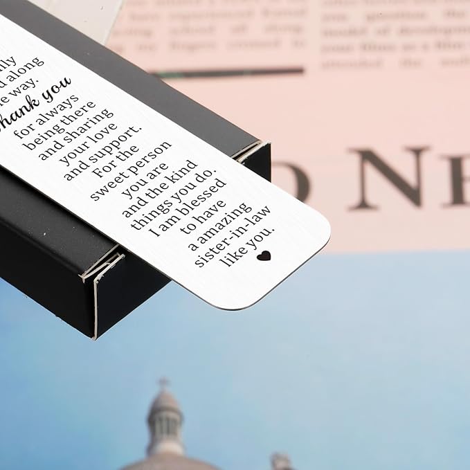 - 【What You Receive】 A bookmark (5.12*1.03*0.02 inch), a cordate accessory, a gift box. The sister in law bookmark is very unique, elegant and delicate. In addition, the material of the bookmark is made of high-quality stainless steel, which is not easy to rust and deformation. The sentence on the gift is also very inspirational, and the font is engraved, clear and easy to read. This small bookmark is practical and meaningful. I believe your daughter-in-law will like this gift.
