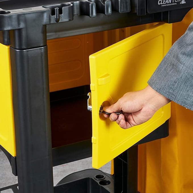 - LOCKING CABINET DOORS: Storage made simple and efficient! This heavy-duty janitor cart is equipped with single locking cabinet doors to keep cleaning supplies secure during transport.