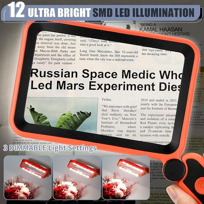 - Touch Switch & Adjustable Lighting: The full page magnifier has 12 super-bright LEDs. Easily illuminate your reading material. Simply touch the on/off switch on the magnifier handle to set the desired brightness easily. The LEDs provide bright, even light to ensure every detail is visible, reducing eye fatigue and improving the overall viewing experience. A perfect aid for seniors suffering from ageing eyes and macular degeneration
