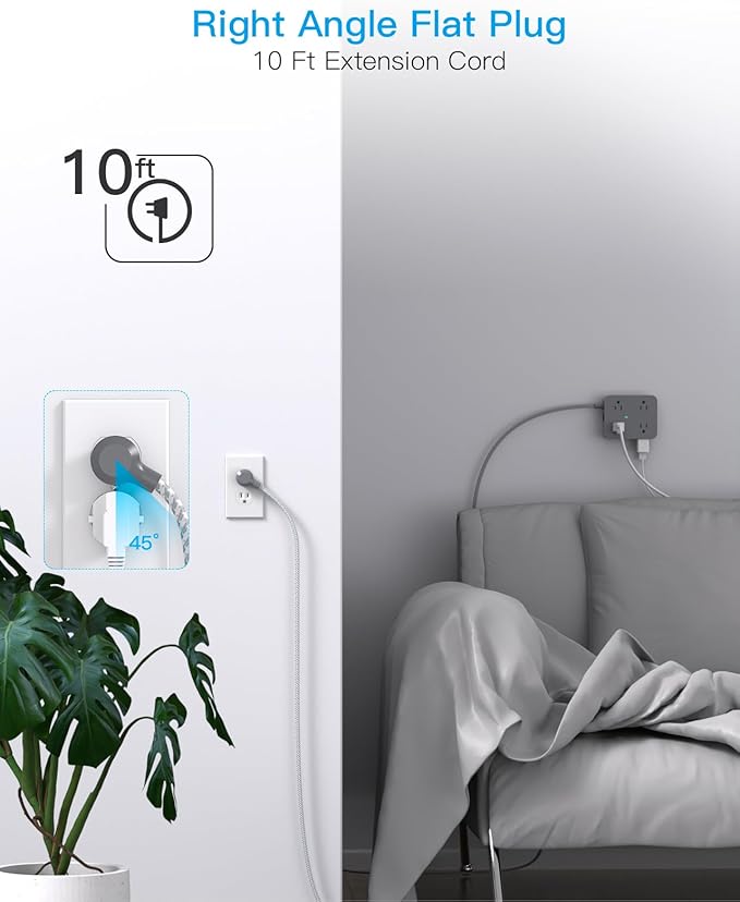 - 【10 Ft Extension Cord with Flat Plug】- The low profile flat plug fits easily in tight spaces; and the right angle flat plug design prevents bottom plug blocking; the 10 Ft braided extension cord is made of pure copper, which has better current carrying capacity (15A), is not easy to deform, durable and more safety; the two mounting holes on back allows this power strip to be securely installed in various applications.