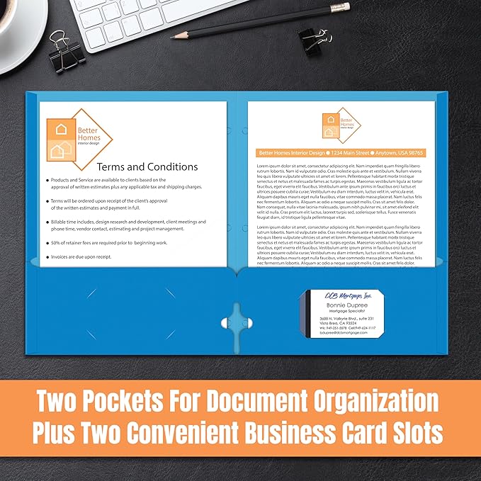 - 2 FLAT POCKETS: Each folder features two spacious 3.75" pockets to hold loose papers and includes two business card slots for easy access to contact information or personalized inserts.
