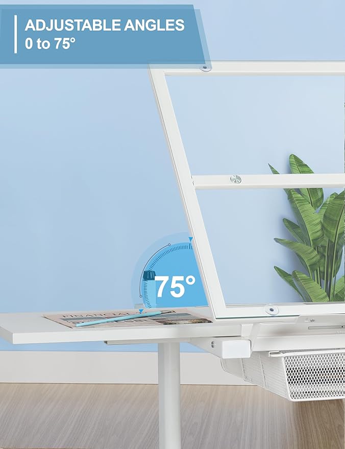 - This Height Adjustable Drafting Desk offers adjustable heights (29.5" to 42.3") and a tilting tabletop (0° to 75°), perfect for any task. The upgraded hand-crank mechanism makes height and angle adjustments quick and easy. With a durable tempered glass top and steel frame, it's built to last. Plus, it includes multiple compartments, a 24-inch pencil ledge, and hanging drawers to keep all your tools organized. Ideal for artists and creatives!