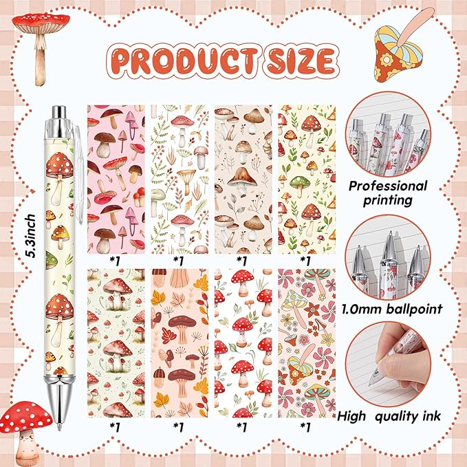 - What You Will Receive: there are 8 mushroom ballpoint pens with different styles in the package, the sufficient quantity and variety of styles are enough to meet your various needs on different occasions; They can also be applied as party favors and holiday gifts for relatives and friends