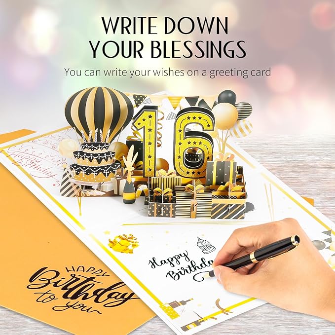 - 💝 QUALITY GIFT GIVING PIECE - Write a blessing on the inside page and slip on a gold beaded envelope, which can be hand-delivered or mailed anywhere in the US. Make an impressive birthday keepsake for someone you love. This beautiful double-sided 16 year old birthday card is the perfect gift for family, friends, girls, boys.