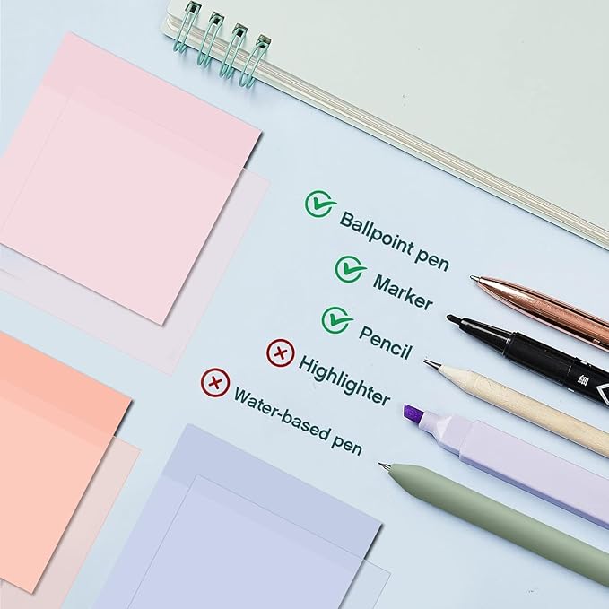 - Smooth Writing Experience: made of quality plastic body, aesthetic pens and highlighters ensures the long period use, not easy to deform or break, comfortable to hold, black ink is quick to dry, providing a fluent writing experience;The black marker is not easy to be erased when writing on the transparent sticky note, which is convenient for you to use