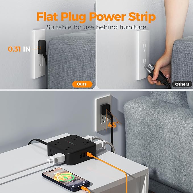 • Easily Flat Plug Power Strip: With only 0.31 inch ultra slim design, this black power strip has a flat plug in real sense; Flat extension cord can fit in tight spaces more easily, hiding behind furniture, beds or refrigerators