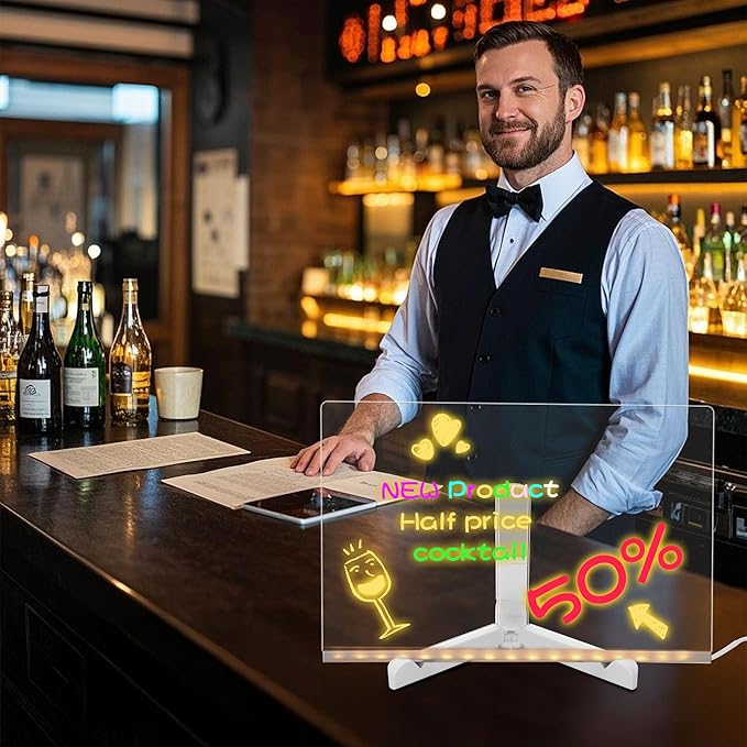 - Extremely Attractive: LED acrylic message board is made of transparent acrylic with a traceless and crystal clear surface. The LED note board base is embedded with a bright LED strip. With just a USB connection to a 5V1A power supply, you can see the drawing board LED lights cast a bright and romantic glow on the acrylic surface, adding warmth and beauty to your writing and drawing messages and creating a captivating neon effect that ensures they grab attention immediately