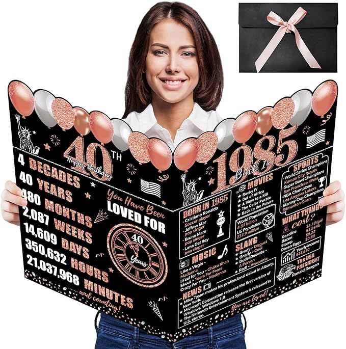 - [BACK IN 1985 Theme] - Big 40th birthday greeting card, the double-sided design incorporates rose gold tones, featuring birthday elements like balloons and fireworks, have three-dimensional balloon shapes, commemorating significant events from 1985. It is unique interesting and meaningful