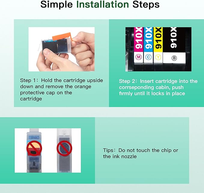 - PACKAGE INCLUDES: Acaves 910XL Ink Cartridges for HP Printers package contains 1 * Black 910XL Ink Cartridges, 1 * Cyan 910XL Ink Cartridges, 1 * Magenta 910XL Ink Cartridges, 1 * Yellow 910XL Ink Cartridges (4 Pack).
