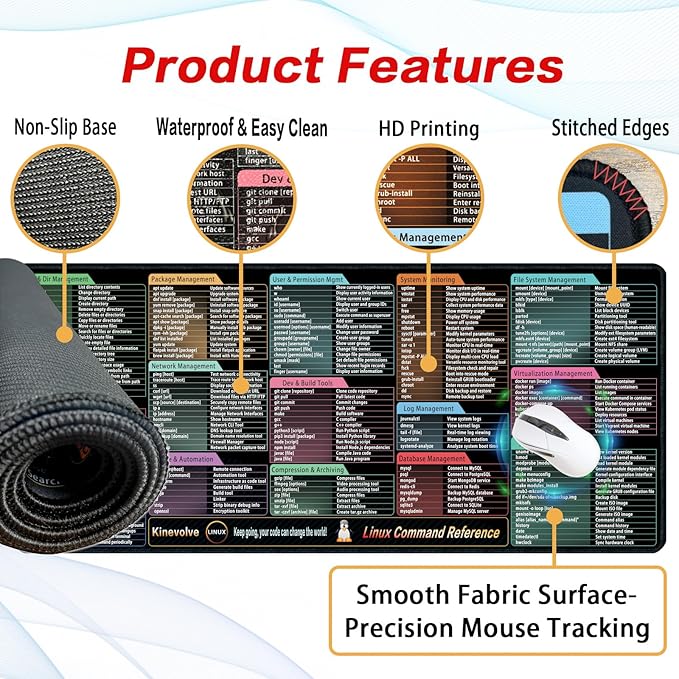 - Linux Command Collection: This mouse pad features a wide range of Linux shortcuts and commands to help improve work speed and efficiency, making it ideal for both beginners and experienced users.