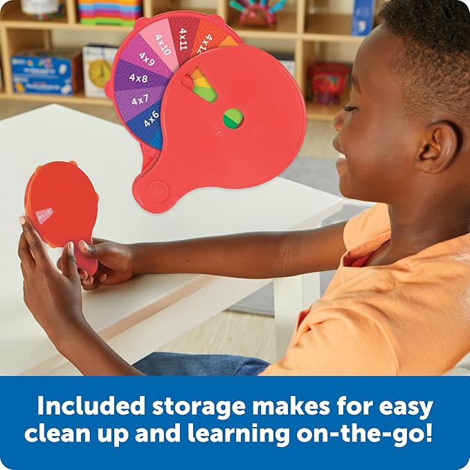 - Spin & Learn: Kids build new multiplication skills every time they pop in a number flash card, spin to an equation, and flip to check the answer!