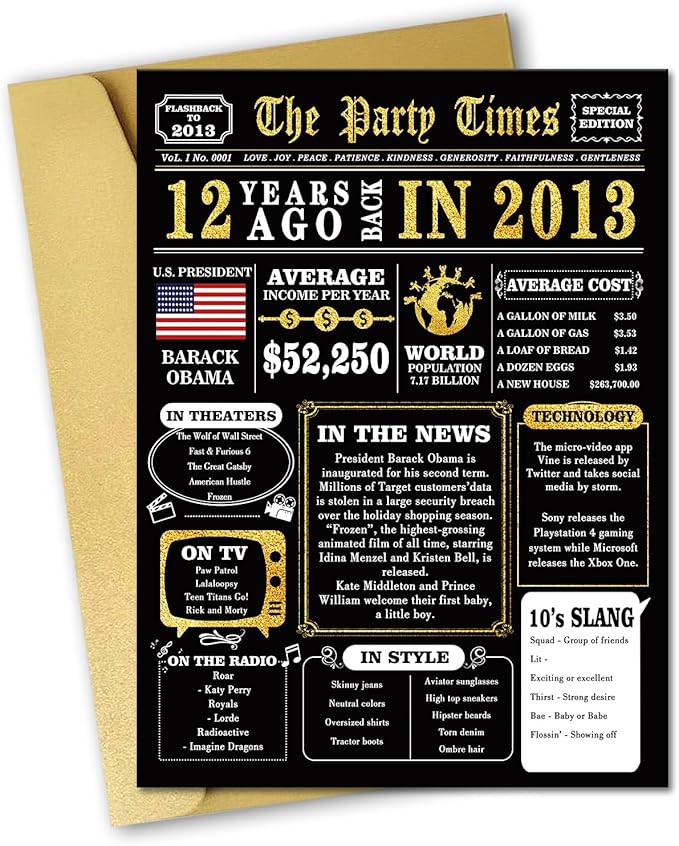 - PERFECT GIFT IDEA -Find interesting 12th birthday cards for your kids. The cards contain some specific events in 12 years ago, which can help you review interesting events with family and friends.