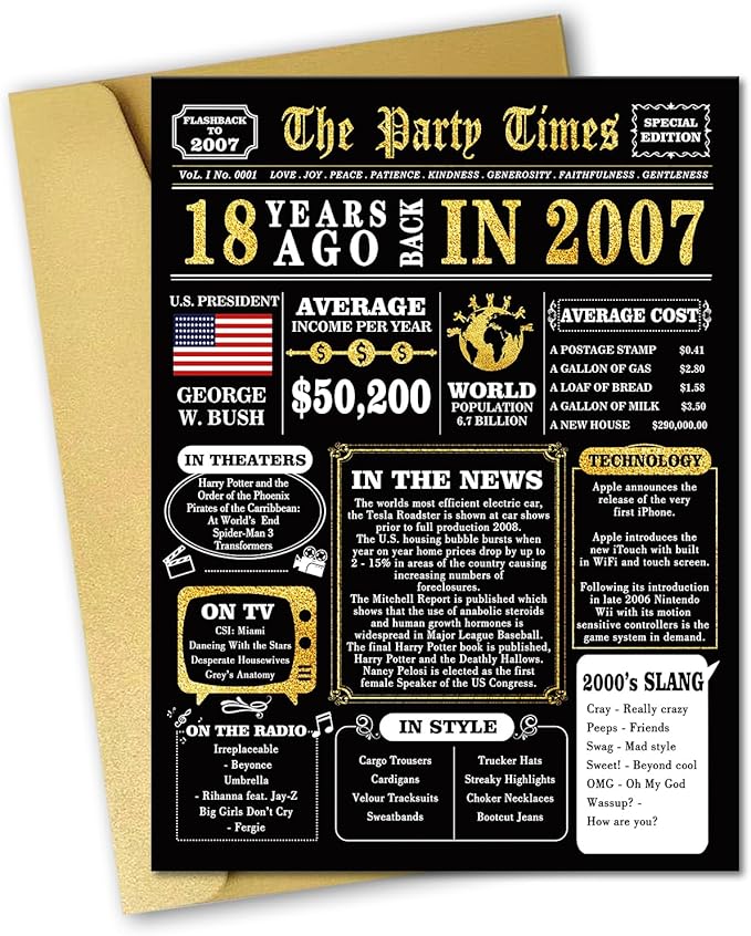 - PERFECT GIFT IDEA -Find interesting 18th birthday cards for your kids. The cards contain some specific events in 18 years ago, which can help you review interesting events with family and friends.