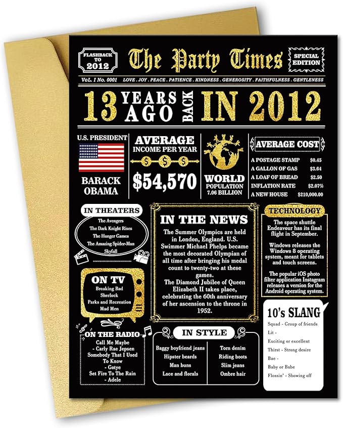 - PERFECT GIFT IDEA -Find interesting 13th birthday cards for your kids. The cards contain some specific events in 13 years ago, which can help you review interesting events with family and friends.